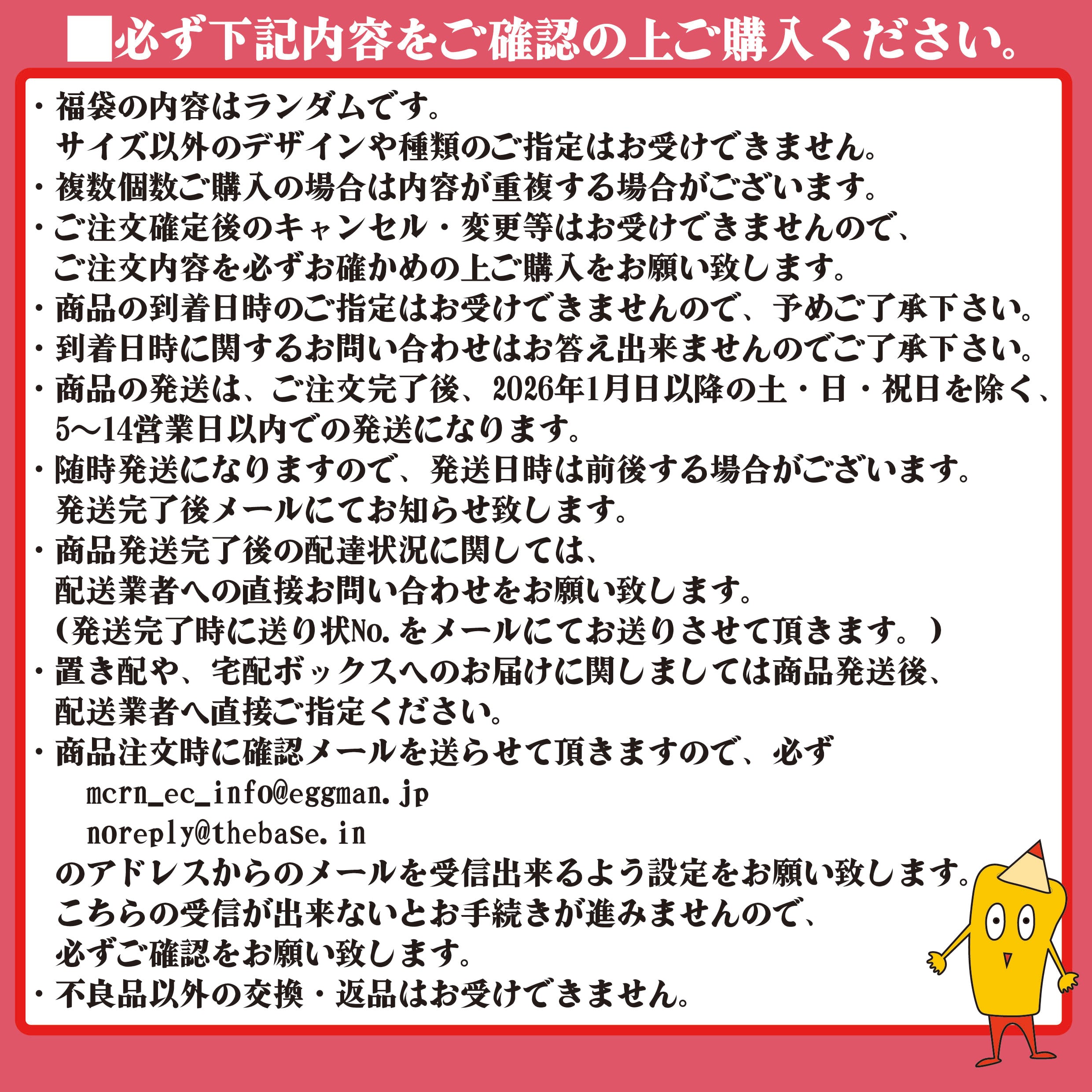 ・商品注文時に確認メールを送らせて頂きますので、必ず